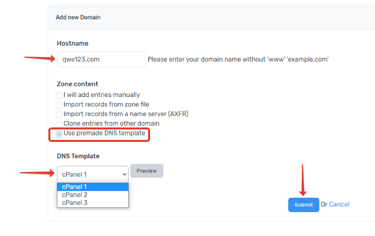 Enter your domain name in the "Hostname" field without WWW. If you want to point your domain to cpanel web hosting - you will need to select " Use premade DNS template", choose template and click on "Submit" button :